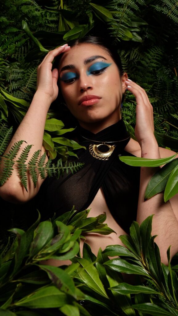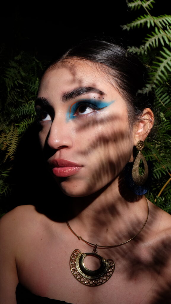 La deidad de la tierra se caracterizó por una piel con acabado mate, que evocaba textura, contención y estabilidad. Sus sombras azules aportaron profundidad y contraste, simbolizando la influencia del cielo y el agua sobre la superficie terrestre. El delineado fuerte acentuó la mirada, dando una sensación de firmeza y dominio. Las cejas, completamente ajustadas a la piel, generaron una apariencia pulida y controlada, reflejo de la conexión con lo sólido y lo estructural. Los labios en tono naranja aportaron calidez y energía, mientras que los ligeros toques de brillo en los costados del rostro evocaron la vitalidad natural y el resplandor del suelo húmedo bajo la luz